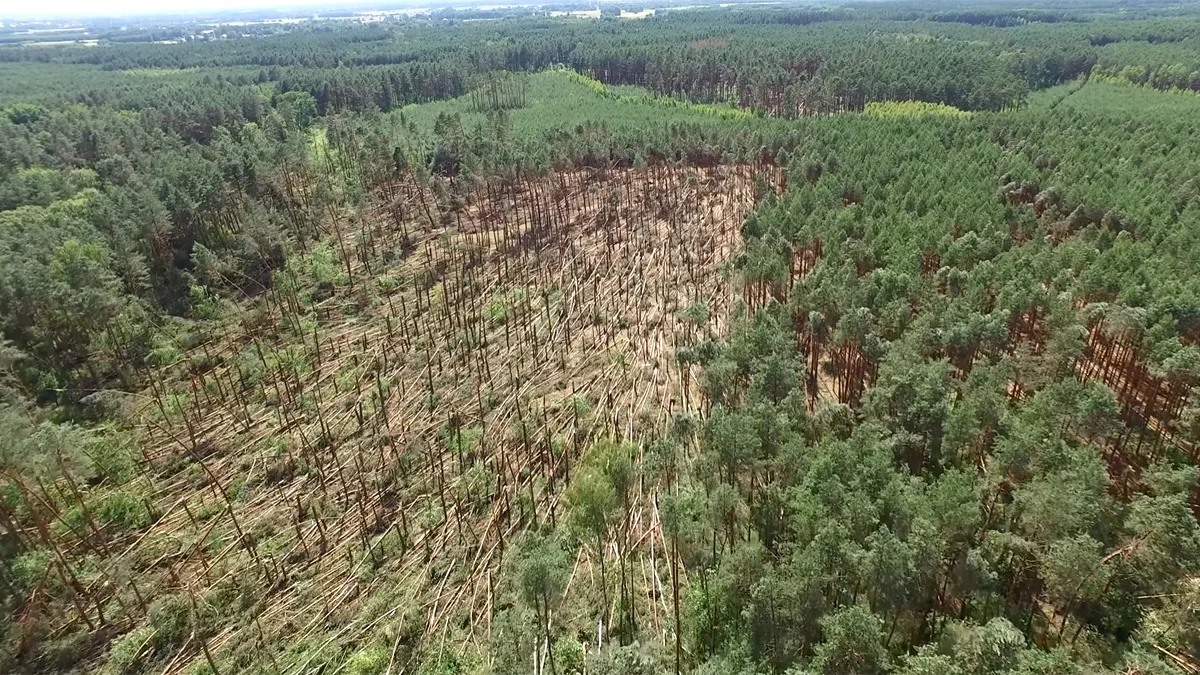 - Korytarz trąby powietrznej na podstawie obrazu z dronu można szacować na długość 20 kilometrów i szerokość około 800 metrów. W tej chwili udrażniamy leśne dukty przy użyciu własnych sił, pomagają nam również inne służby. Dla uprzątnięcia powierzchni klęskowej potrzebny będzie sprzęt specjalistyczny, zaś masę drewna ze zniszczonych huraganem drzew, bardzo wstępnie trzeba szacować na około 30 tys. metrów sześciennych